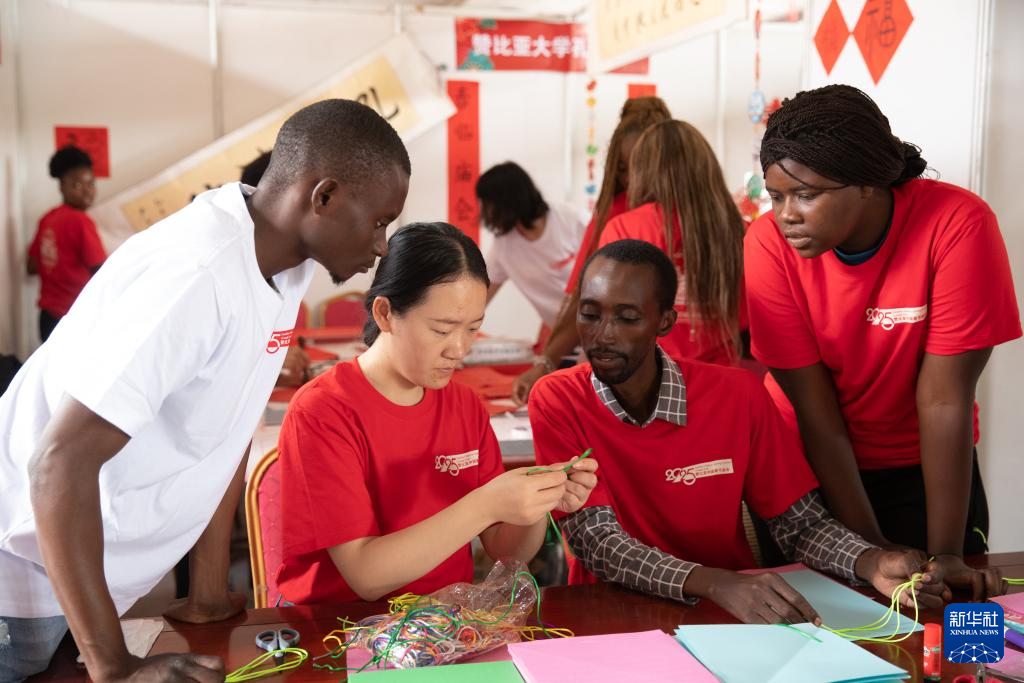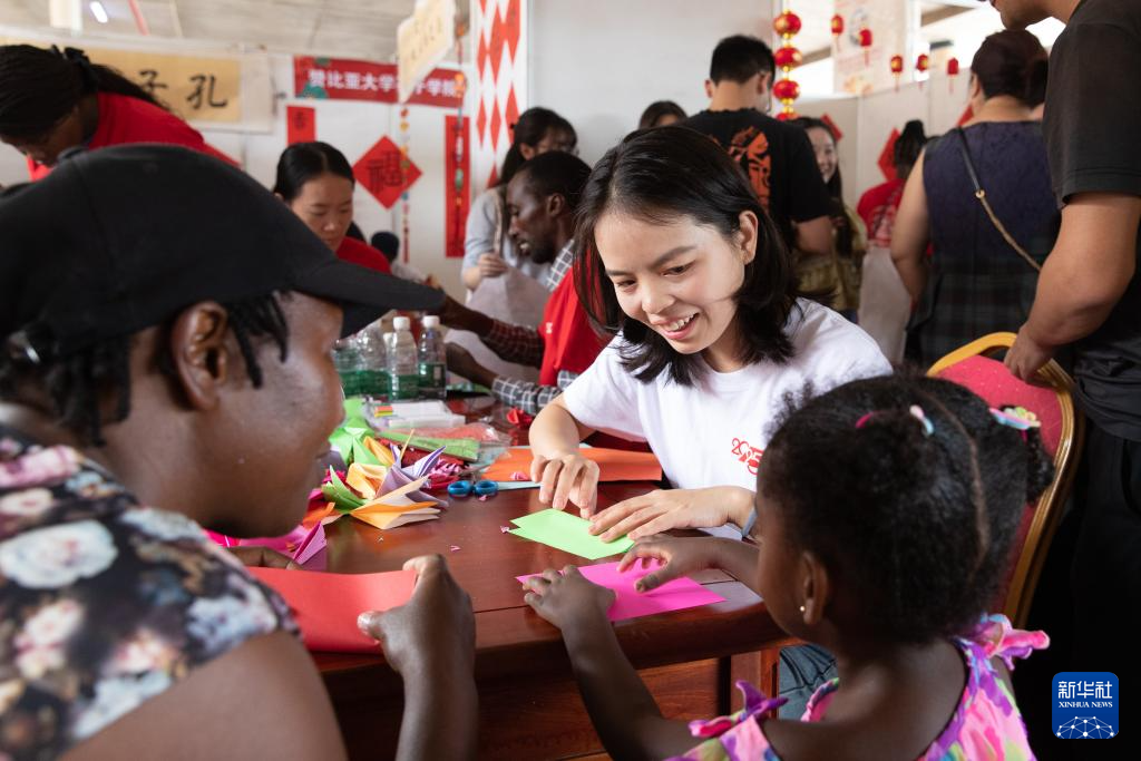 在廟會現(xiàn)場的贊比亞孔子學院展位前,人頭攢動。包括書法體驗、剪紙、折紙展示和猜字謎等豐富的文化互動項目,吸引人們紛紛參與體驗。一位贊比亞媽媽帶著孩子在老師指導下完成她的第一個中國結作品,她高興地說:“原來中國藝術這么有趣!希望我的孩子有一天可以去孔子學院學習。”