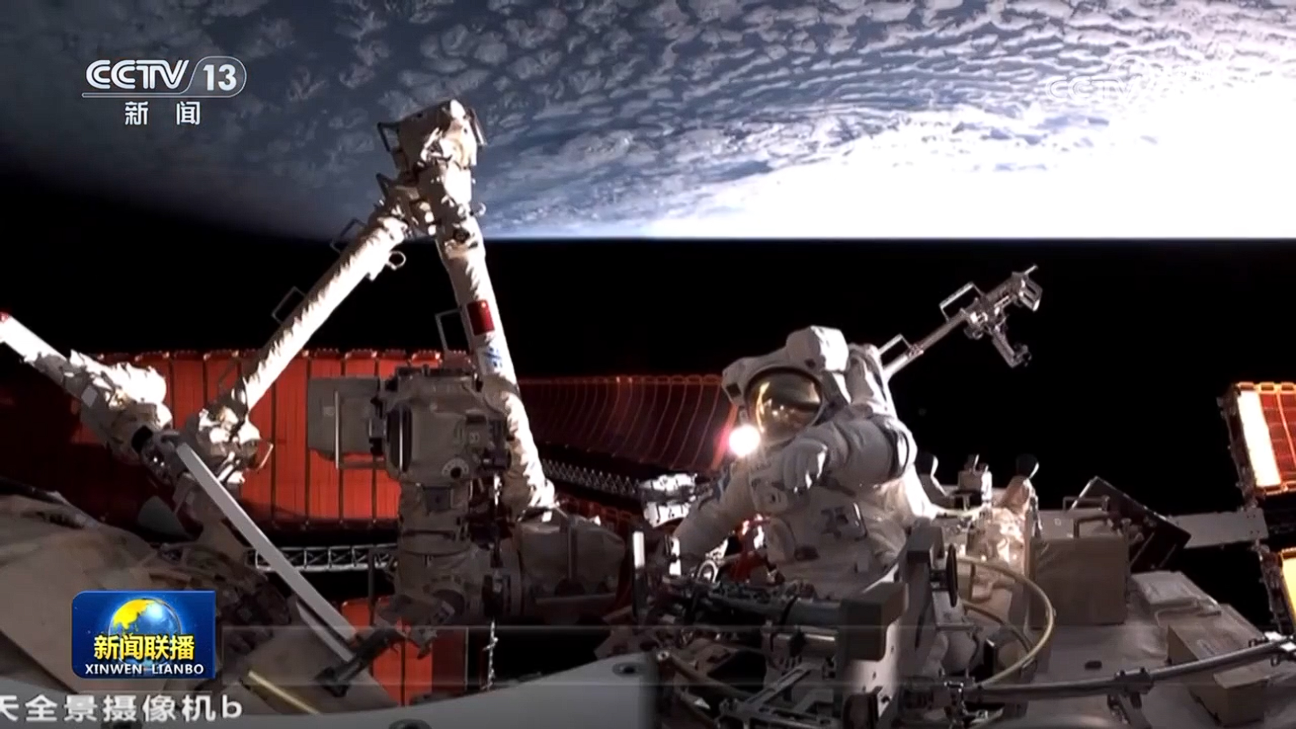 約2個小時后,蔡旭哲順利出艙,沿艙壁自主轉移至作業點,與宋令東協同配合,對問天艙線纜進行防護裝置的安裝操作。其間,航天員王浩澤在天和核心艙內進行支持。