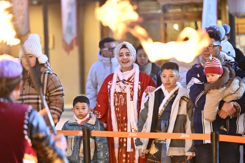 1月14日,外國友人在銀川市漫葡小鎮觀看演出。 新華社記者 王鵬 攝