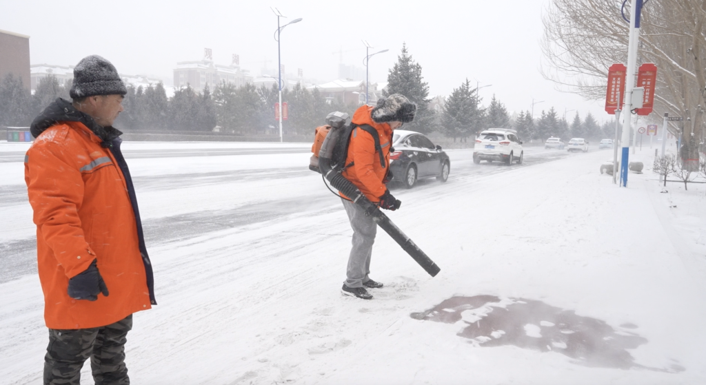 背上清掃機,扣動開關(guān),左右搖擺風槍,看著成片的浮雪被吹散,記者似乎找到了“童趣”,然而很快便體會到了這項工作的不易:十多公斤對記者來說不算重,但它并不像書包那般柔軟,堅硬的汽油機轟鳴震動,沒有緩沖地拍打著脊背。短短十多分鐘,起初的新鮮感和樂趣便已消失,只有噪音為伴。