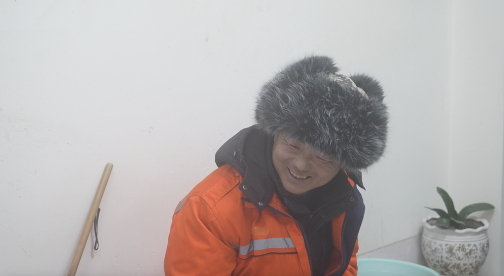從下午1點半到4點,記者和工友們一刻未停。風雪中,大伙都變成了“白眉大俠”,睫毛上也結(jié)了冰。王師傅提出,去附近的環(huán)衛(wèi)驛站里歇歇腳,喝些熱茶。