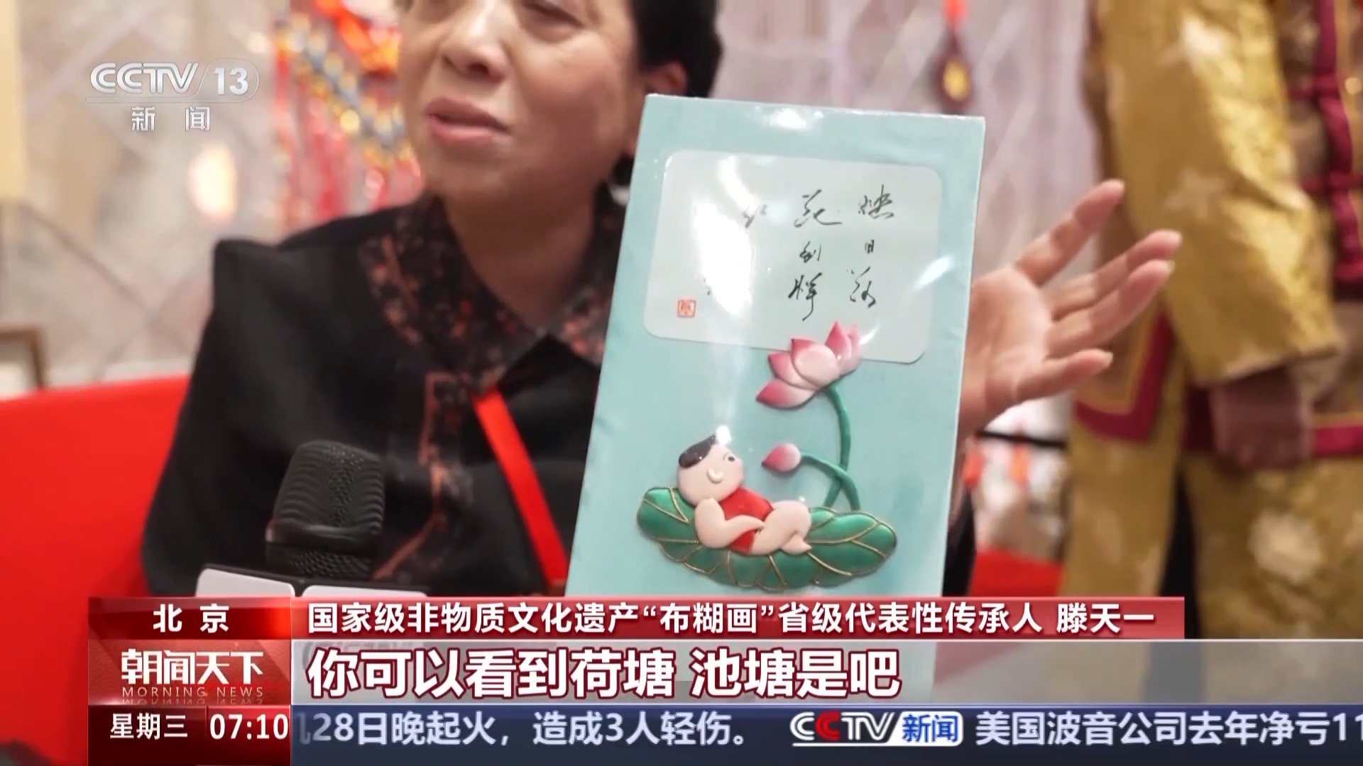 北京國家級非物質文化遺產(chǎn)“布糊畫”省級代表性傳承人 滕天一:很多手工掛件做完了到不了一分鐘就買走了。從古到今幾千年了,我們中國的東西到哪兒你細看,它是有內涵的東西。比如說我拿了楊萬里的一句詩“映日荷花別樣紅”你可以看到荷塘、池塘是吧,再想到我們的詩、詩人,它都是有意境的。