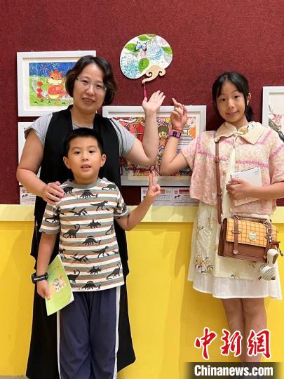 2024年暑期,許志宏一家人前往北京觀展。圖為許志宏的妻子與兒女在畫作前合影留念。受訪者供圖