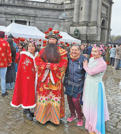 在比利時布魯塞爾舉辦的“中國春節游園廟會”上,當地觀眾與廟會演員合影。記者 牛瑞飛攝