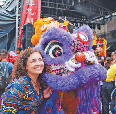 當地時間2月1日,在巴西圣保羅市中心自由廣場舉辦的歡樂春節園游會開幕式上,當地民眾與舞獅表演者合影。記者 時元皓攝