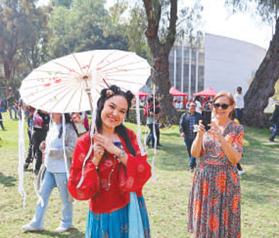 在墨西哥第四屆中國新年文化節上,當地青年身著中國傳統服飾留影紀念。本報墨西哥分社 埃內斯托·多明戈斯攝