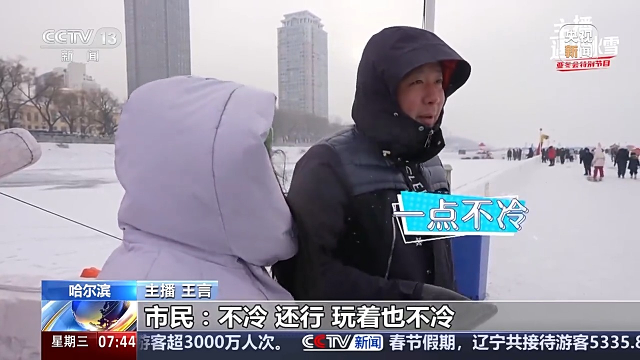 主播 王言:天色漸晚,但是我們看松花江上活力不減,今天其實因為寒潮來襲還挺冷的,但是我采訪一天聽到最多的詞就是不冷,開心!哈爾濱有一個名字叫冰城,在我看來這個冰城的冰就是活力的冰,不管你來自哪兒,只要踏上這里的冰,就能夠感受到滿滿的活力,不管是來這兒玩冰賞雪的人,還是在這里工作的工作人員,大家都能夠感受到冰天雪地帶來的勃勃生機。