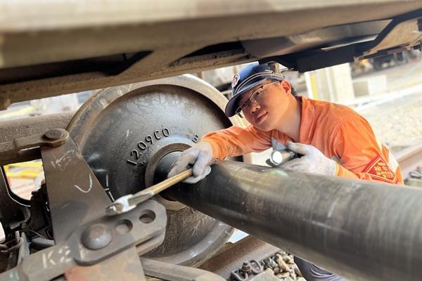 1時(shí)30分,作業(yè)人員攜帶道尺、檢查錘、油壺等材料工具,向站場(chǎng)西邊進(jìn)發(fā),點(diǎn)點(diǎn)頭燈猶如點(diǎn)點(diǎn)螢光,緩緩向前方移動(dòng)。10分鐘后,左自強(qiáng)抵達(dá)14號(hào)道岔,他彎下腰,將道尺卡在鋼軌間讀取數(shù)值。“0.5、0.4、0.5……”他邊檢查邊記錄,不放過(guò)一處問(wèn)題隱患。在一顆松動(dòng)螺栓處,左自強(qiáng)先用手旋緊,再用扳手緊固,最后雙手用力下壓扳手,直至螺栓紋絲不動(dòng)。“一顆螺栓松動(dòng),就可能帶來(lái)重大安全隱患。再細(xì)小的事情我們也要認(rèn)真仔細(xì)地做好。”左自強(qiáng)說(shuō)。