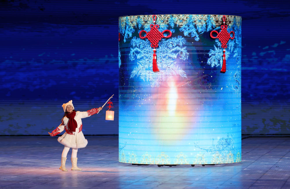 一個穿白衣裙、戴紅圍巾的女孩提著盈盈微光的小冰燈,點亮舞臺中央的大冰燈。隨后,34名孩童手提冰燈圍合環抱在一起,象征本屆亞冬會34個亞洲參賽國家和地區凝心聚力,共同點亮夢想。