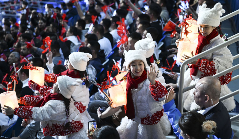 在張燈結彩的“中國雪鄉”畫卷前,演員手持雙色“冰凌手絹花”旋轉翻騰,一面為冰晶藍,一面為中國紅。亞冬會開閉幕式視覺總設計劉猛說,在中國東北,“手絹花”是喜慶祥和的年味標識,表達東道主喜迎八方賓朋的盛情。