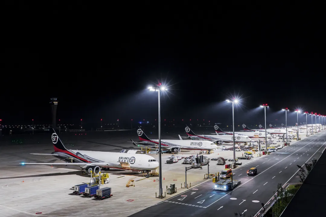 圖為夜幕下的花湖機(jī)場(chǎng)上,順豐航空的地勤人員正在繁忙作業(yè)。順豐鄂州樞紐供圖