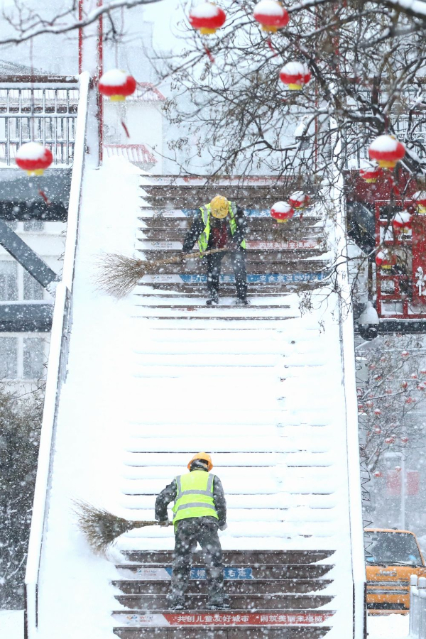 2025年1月28日,在山東省威海市環翠區,市政工人冒雪清掃過街天橋積雪。新華社發(劉中華 攝)