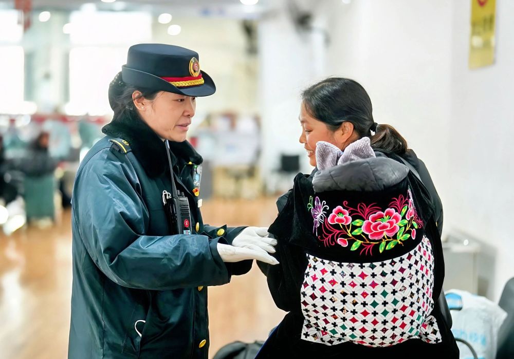 2025年1月29日,國鐵武漢局襄陽站客運員穆佟在為旅客服務。新華社發(劉娟 攝)