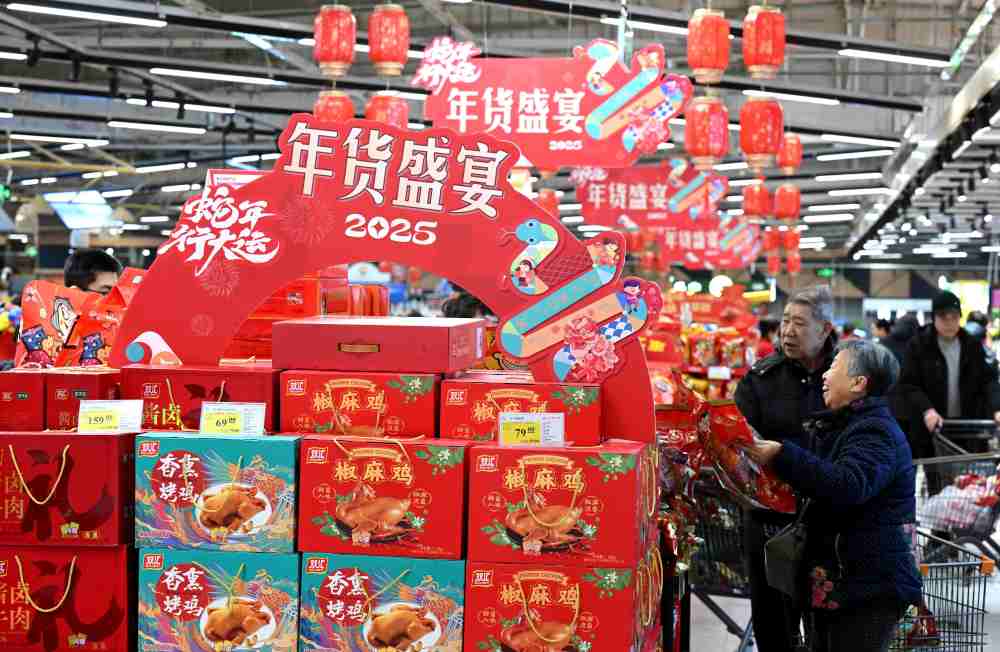 2025年1月24日,顧客在河北省石家莊市新華區北國超市中環店選購年貨。新華社發(陳其保 攝)