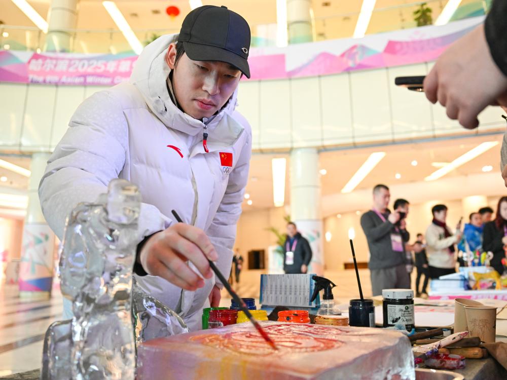 ↑在第九屆亞冬會(huì)運(yùn)動(dòng)員村,中國代表團(tuán)的冰球運(yùn)動(dòng)員張澤森在體驗(yàn)拓彩冰雪畫。新華社記者 王曦 攝
