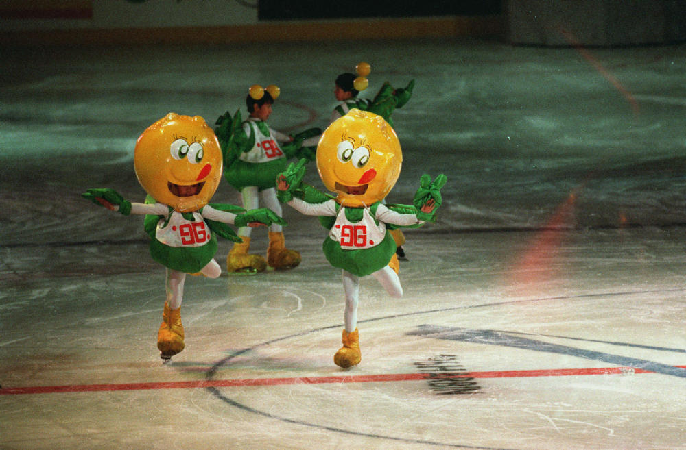 在哈爾濱舉行的第三屆亞冬會開幕式上,大型藝術表演《太陽·冰雪·亞細亞》中,本屆亞冬會吉祥物豆豆伴隨著活潑的兒歌,在冰上歡快地滑行。新華社記者 羅更前 攝(傳真照片,1996年2月5日發)