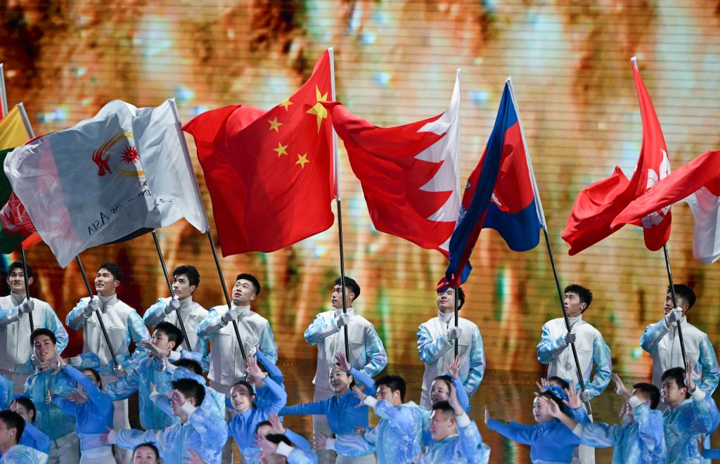這是2月14日拍攝的各體育代表團入場環節。當日,第九屆亞洲冬季運動會閉幕式在哈爾濱舉行。新華社記者 黃博涵 攝