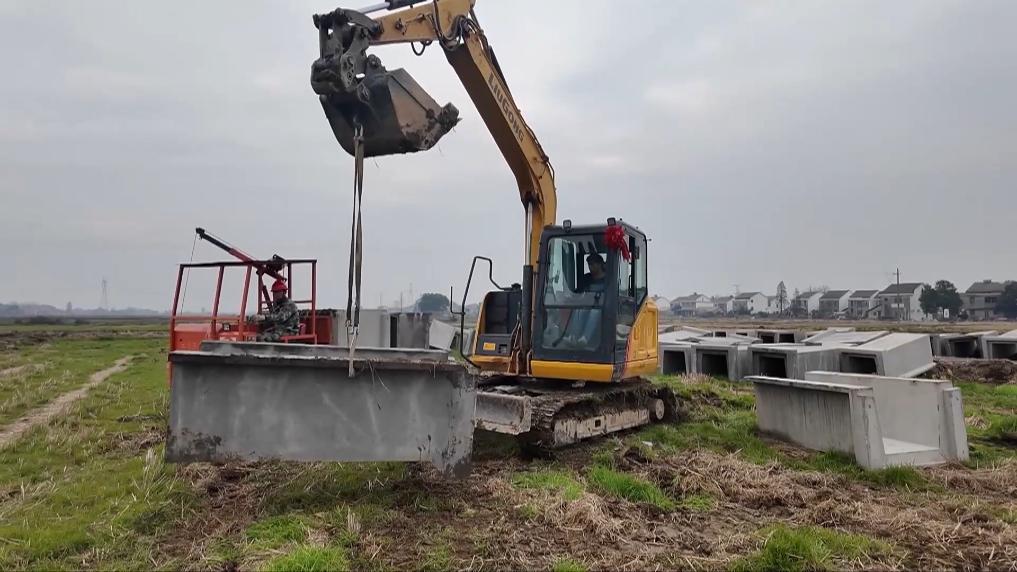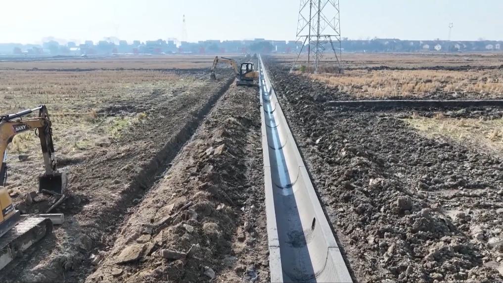 在資陽區沙頭鎮富興村高標準農田建設現場,工人們正緊張有序地開挖渠道、安裝渠槽。