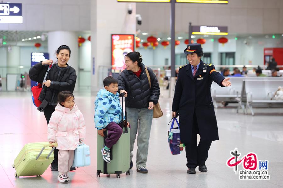2025年春運期間 ,南昌站工作人員為旅客指引候車位置。中國網發 劉慕/攝