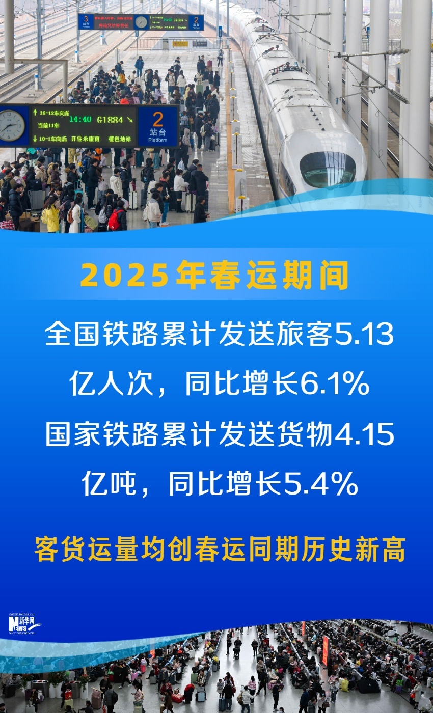 為期40天的2025年鐵路春運圓滿收官。春運期間,全國鐵路累計發送旅客5.13億人次,同比增長6.1%,國家鐵路累計發送貨物4.15億噸,同比增長5.4%,客貨運量均創春運同期歷史新高。