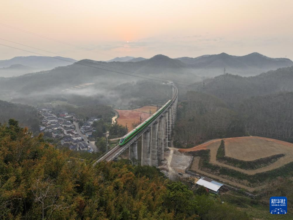 圖為2月22日,動車組列車行駛在云南省景洪市境內的中老鐵路上(無人機照片)。