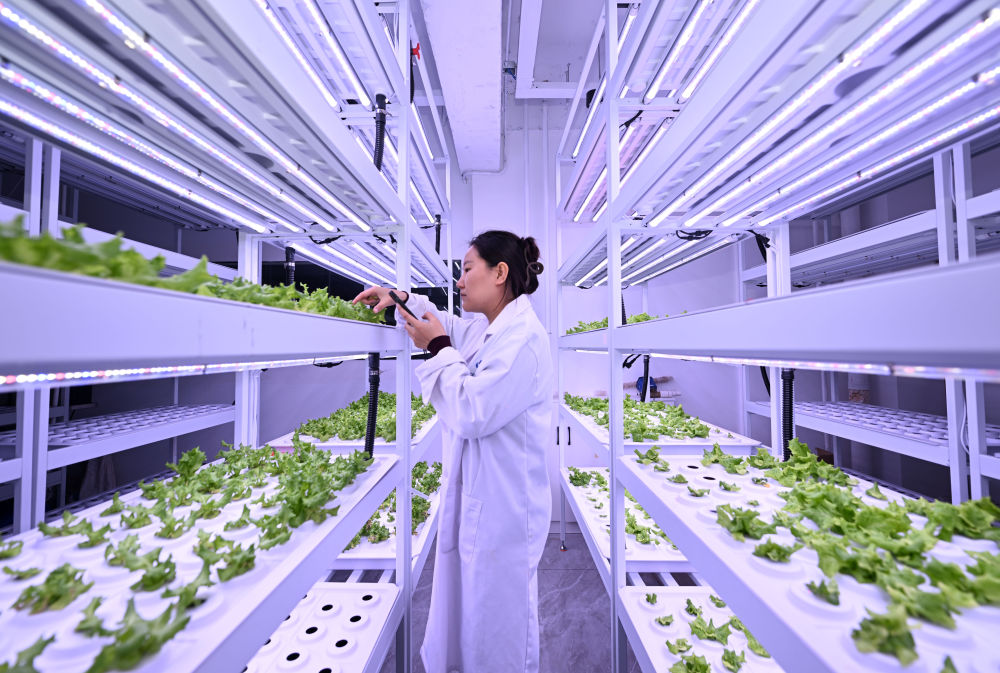 科芯(天津)生態農業科技有限公司工作人員在實驗室查看農作物生長情況。 新華社記者 趙子碩 攝