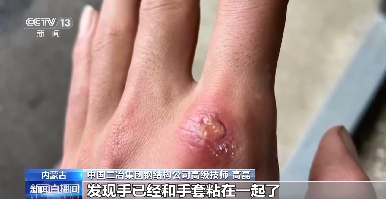 中國二冶集團鋼結構公司高級技師 高磊:如果你中途停止的話,再重新起弧就可能造成焊接缺陷,我就沒有選擇停,我就咬著牙堅持把這段焊縫完成,直到焊到最后,等我往下摘我的焊工手套的時候,發現手已經和手套粘在一起了,燙出特別大一個水泡。