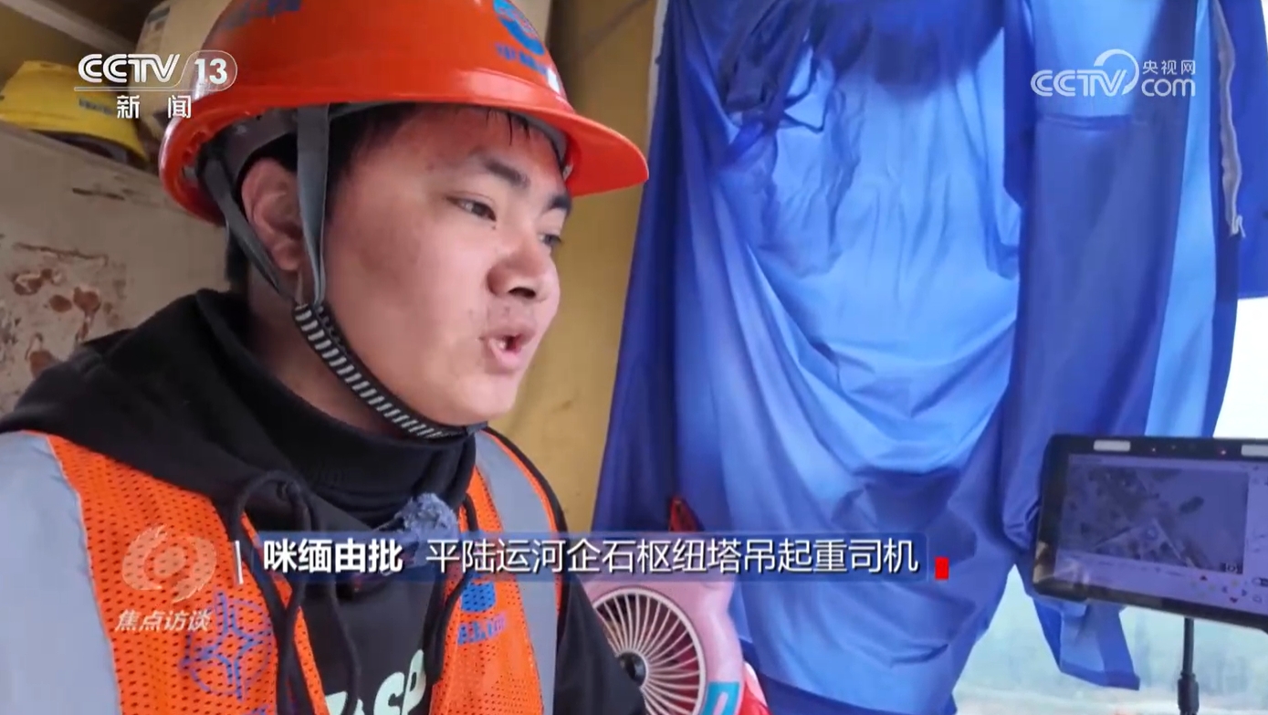 平陸運河企石樞紐塔吊起重司機咪緬由批:“第一次爬的時候是40米的那種(塔吊),剛開始就是特別害怕,腿也是發抖,一步一個腳印,就是冒著汗慢慢爬上來,然后練成了這個膽量,慢慢就習以為常了。”