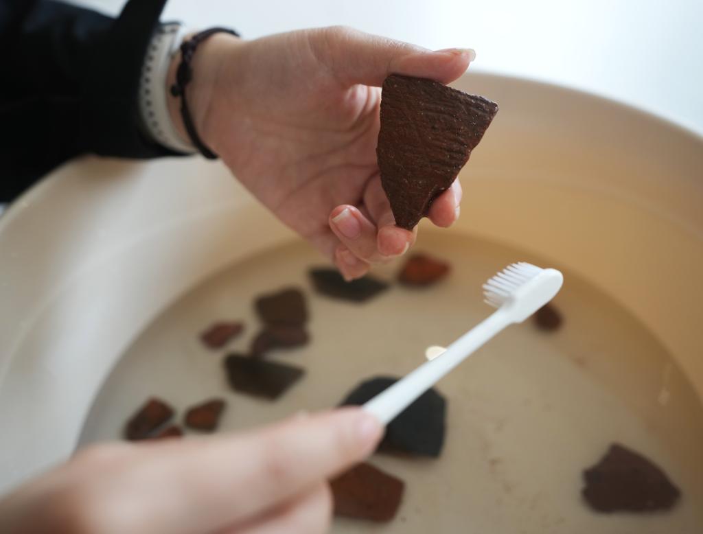 3月11日,在遼寧省朝陽市北票市的考古人員住所,考古人員在清洗調查現場發現的碎陶片。當日,來自遼寧省文物考古研究院的考古人員在遼寧省朝陽市雙塔區調查紅山文化遺址。此前,考古人員在遼寧省朝陽市凌源無白丁遺址群新發現多處紅山文化遺跡。新華社記者 李鋼 攝