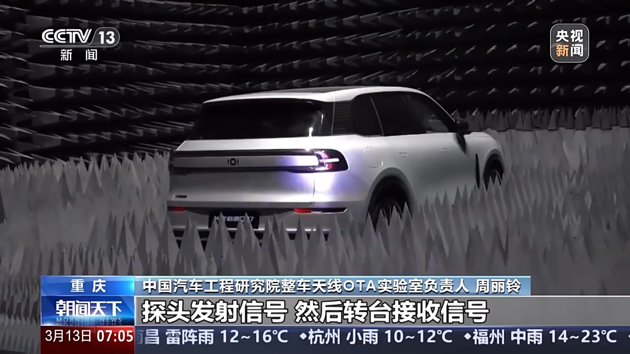 中國汽車工程研究院整車天線OTA實驗室負責人 周麗鈴:這里是我們的一個探頭,然后配我們的轉臺,探頭發射信號,然后轉臺接收信號,這樣的話就可以測汽車的接收性能,那它們互換一下就可以測汽車的一個發射的性能。