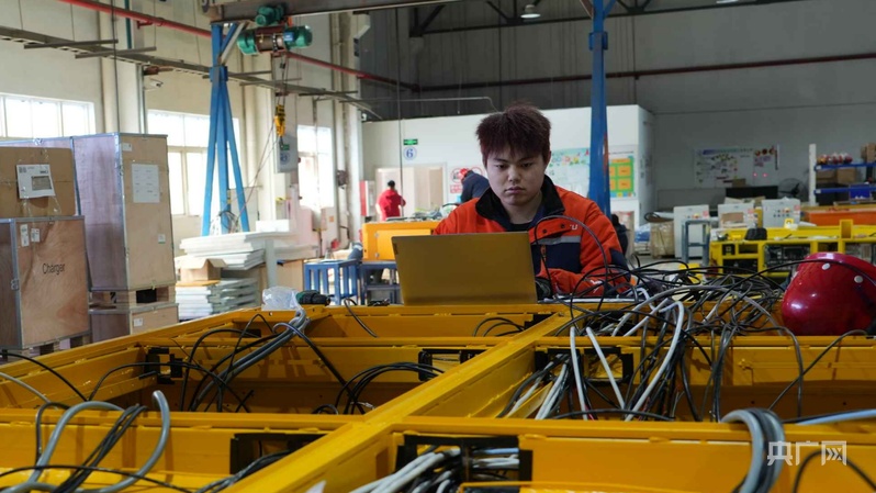 工作人員正在進行重載AGV安裝調試(央廣網記者 周思楊 攝)