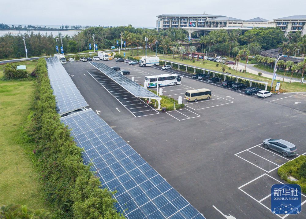 ↑ 在博鰲零碳示范區(qū)拍攝的建有光伏發(fā)電設備的停車場(無人機照片,3月16日攝)。