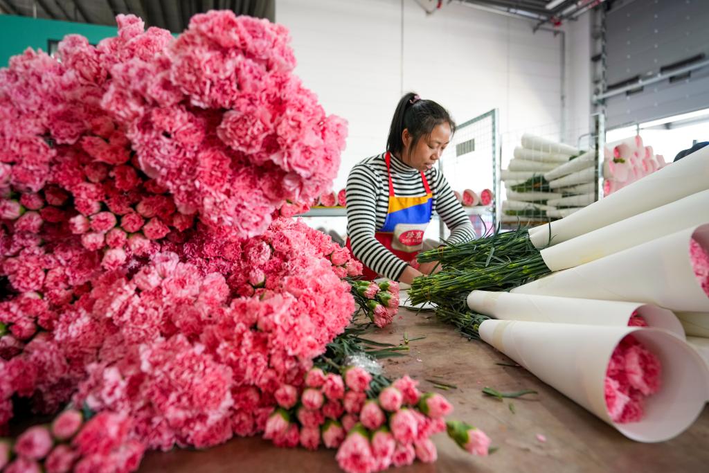 1月22日,一名工作人員在昆明云舍花卉有限公司包裝鮮花。新華社記者 陳欣波 攝