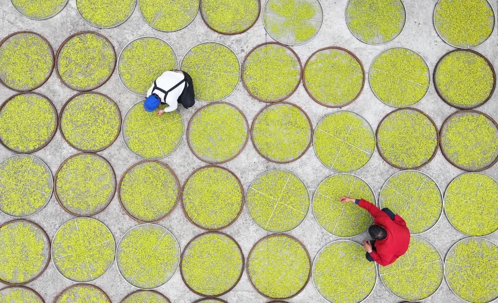 4月7日,在湖南省永州市雙牌縣上梧江瑤族鄉(xiāng)盤家村云臺山生態(tài)有機(jī)茶園,茶農(nóng)在攤曬春茶(無人機(jī)照片)。新華社發(fā)(何紅福攝)