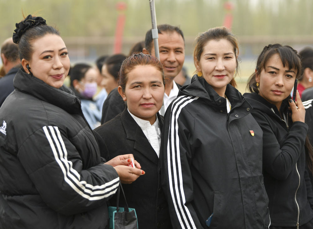柔鮮古麗(右二)和奧依托格拉克鄉的村民在一起。新華社記者胡虎虎攝