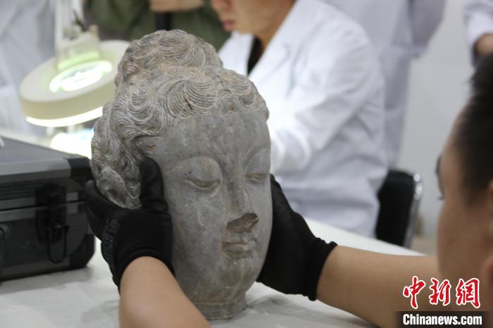 5月20日,河南洛陽,龍門石窟研究院工作人員展示已完成修復的唐代佛頭。 中新社記者 闞力 攝