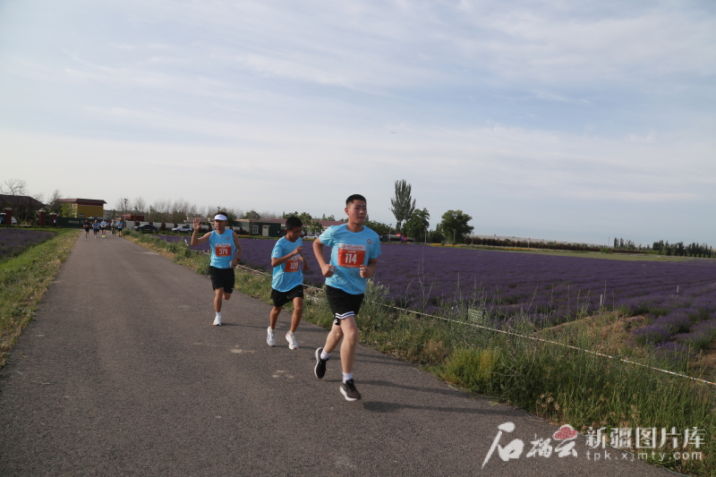 5月31日,霍城縣“2025蘇韻伊情·霞路相逢(霞2·芳香霍城)商學院越野接力賽”開跑。圖為參賽選手跑過一片薰衣草園。石榴云/新疆日報記者 宋衛國 攝