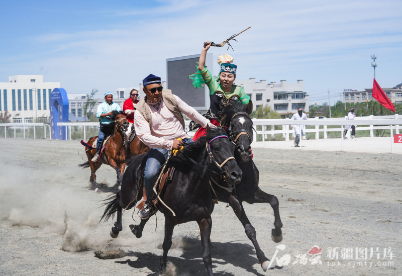 5月31日,中國·新疆第五屆駱駝產業展暨全疆賽馬大會在木壘哈薩克自治縣激情啟幕。活動現場在進行“姑娘追”表演。常誼誼 攝