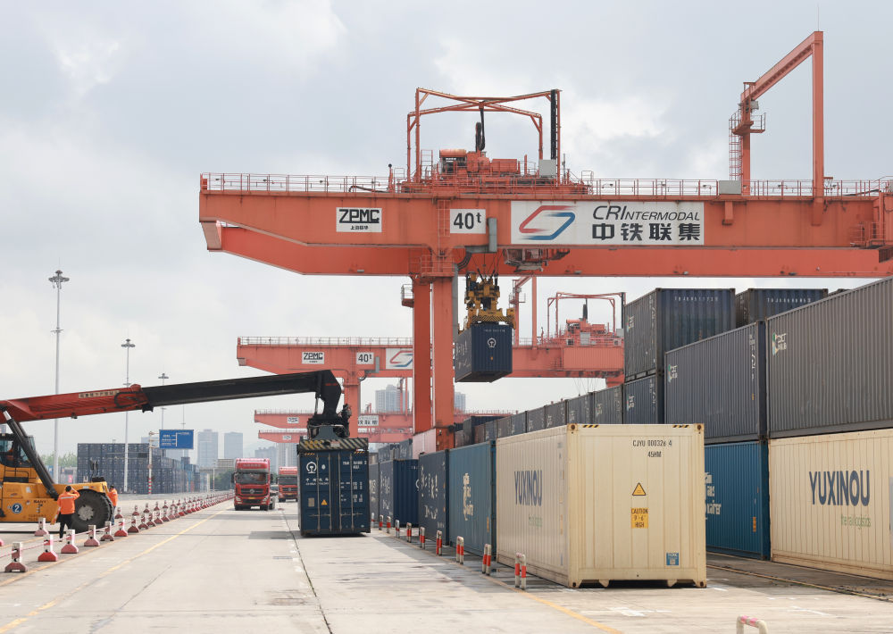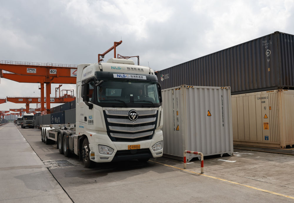 龍門吊不斷起降、轉運卡車川流不息、火車汽笛聲悠揚,各色的集裝箱整齊排放,“陸海新通道”的圖標引人注目……重慶國際物流樞紐園區到處活力涌動。