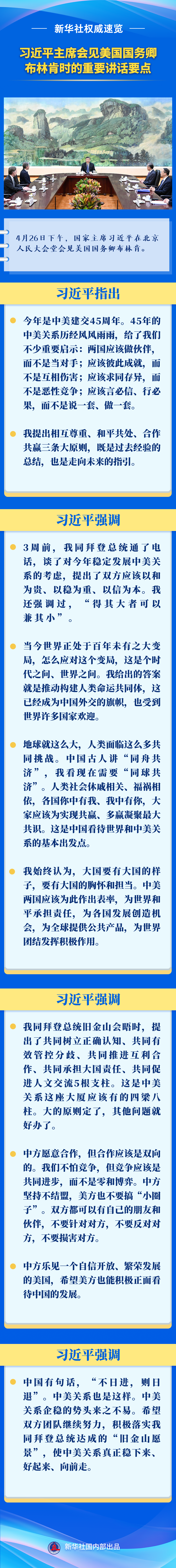 4月26日下午,國家主席習(xí)近平在北京人民大會堂會見美國國務(wù)卿布林肯。來看習(xí)近平主席的重要講話要點(diǎn)。