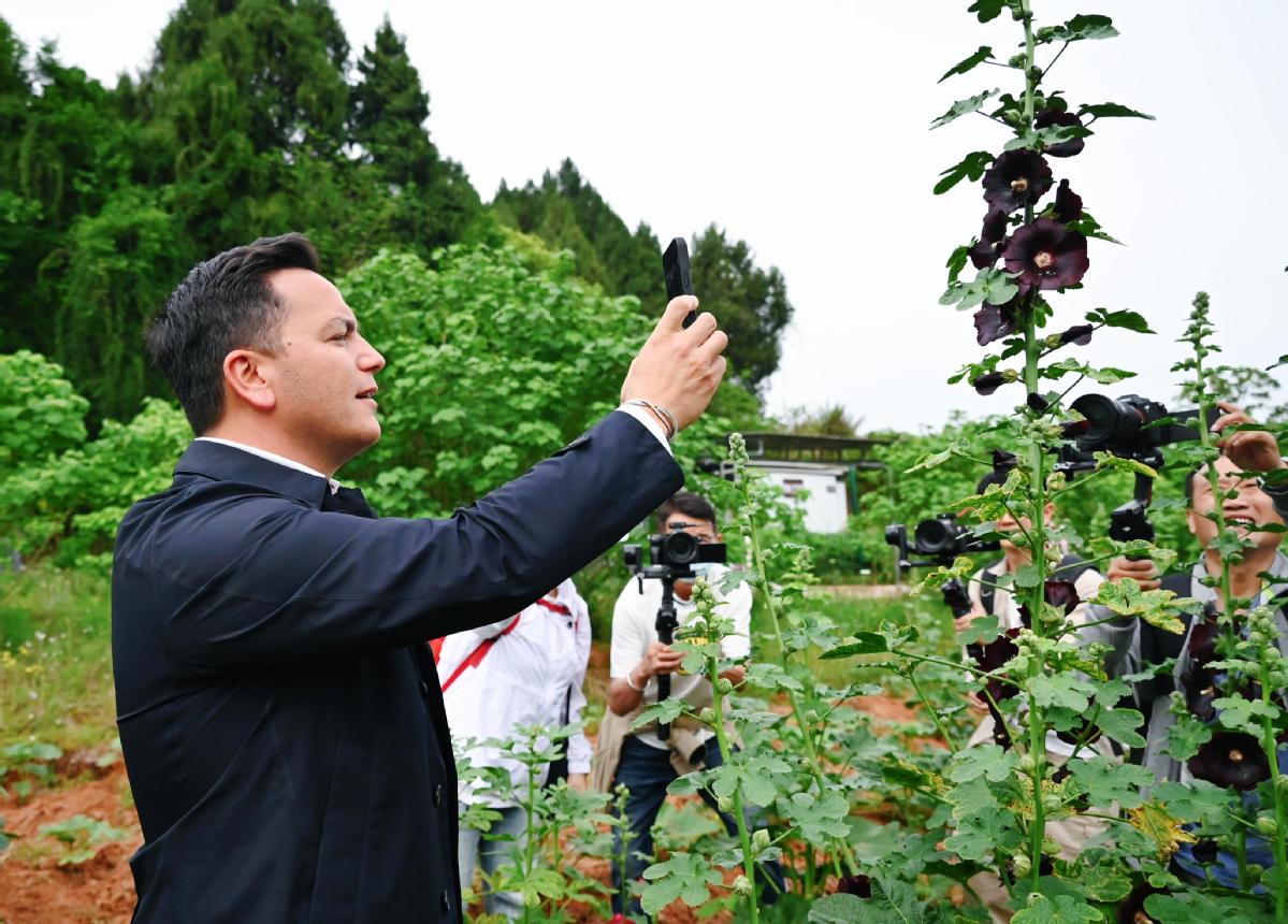 2024年4月23日,國際園藝生產者協會主席萊昂納多·卡皮塔尼奧在成都市金堂縣鮮花山谷景區考察蜀葵產業。