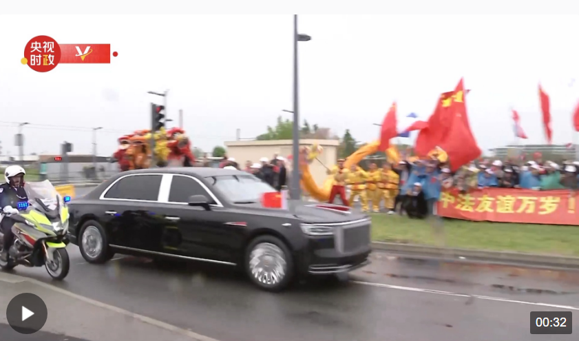 當地時間5月5日下午,國家主席習近平乘專機抵達巴黎。從機場前往下榻酒店途中,包括華人華僑和中國留學生代表在內的歡迎人群揮舞著中法兩國國旗,敲鑼打鼓,舞龍舞獅,熱烈歡迎習近平主席到訪。