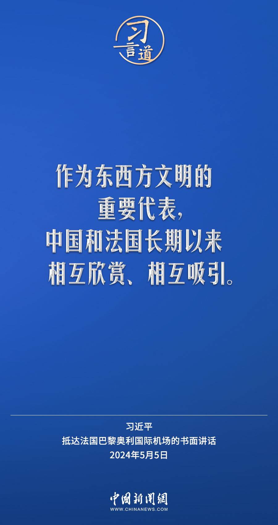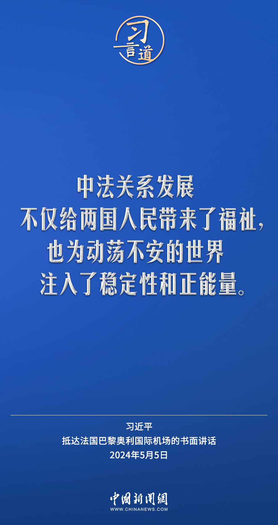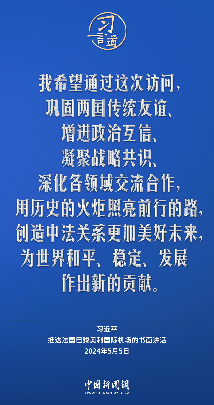 當地時間5月5日下午,國家主席習近平抵達巴黎,開始對法國進行國事訪問。在抵達法國巴黎奧利國際機場的書面講話中,習近平指出——