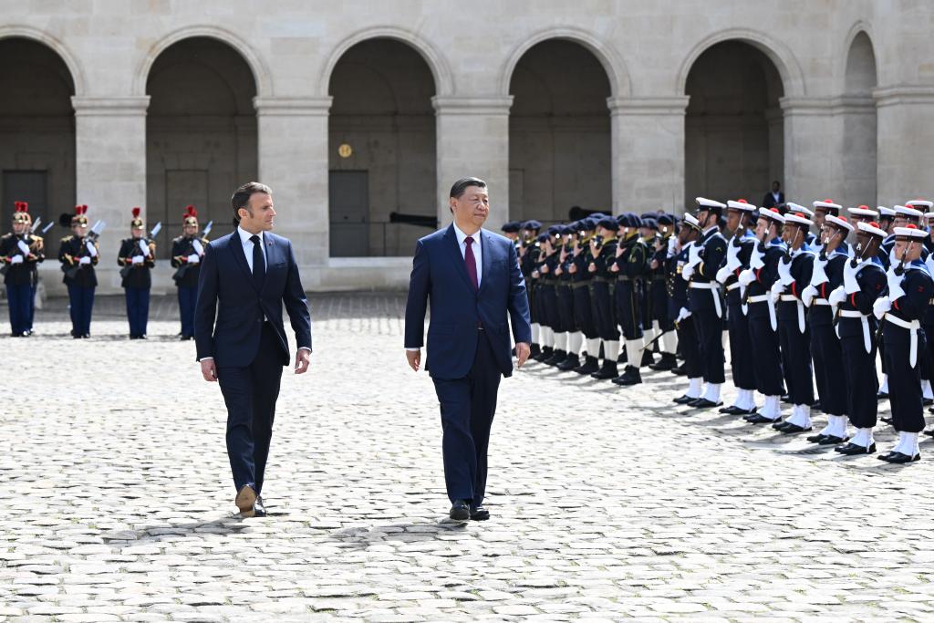 當天下午,習近平在巴黎出席馬克龍舉行的隆重盛大歡迎儀式。兩國元首檢閱法蘭西共和國衛隊和陸海空三軍儀仗隊,并觀看分列式。