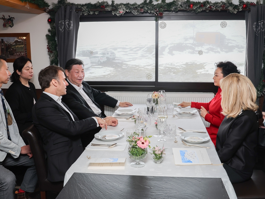 當地時間5月7日,應法國總統馬克龍特別邀請,國家主席習近平乘專機來到法國西南部上比利牛斯省訪問。在圖爾馬萊山口“牧羊人驛站”,習近平和夫人彭麗媛同馬克龍和夫人布麗吉特憑窗而坐,在輕松愉快的氛圍中就一些重要問題進行戰略溝通。新華社記者 姚大偉 攝