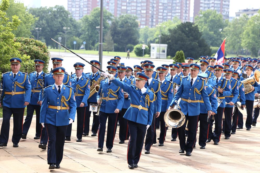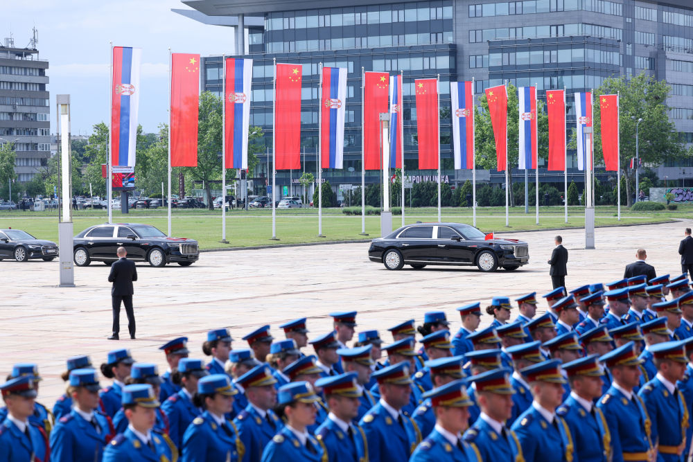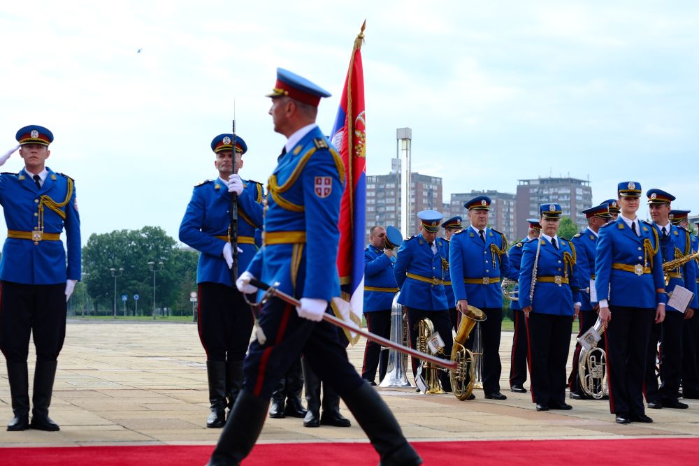 當地時間5月8日,國家主席習近平在貝爾格萊德出席塞爾維亞總統武契奇舉行的隆重盛大歡迎儀式。歡迎儀式在塞爾維亞大廈南廣場舉行。兩國元首共同登上檢閱臺,軍樂團奏響中塞兩國國歌,鳴10響禮炮。習近平在武契奇陪同下檢閱儀仗隊。
