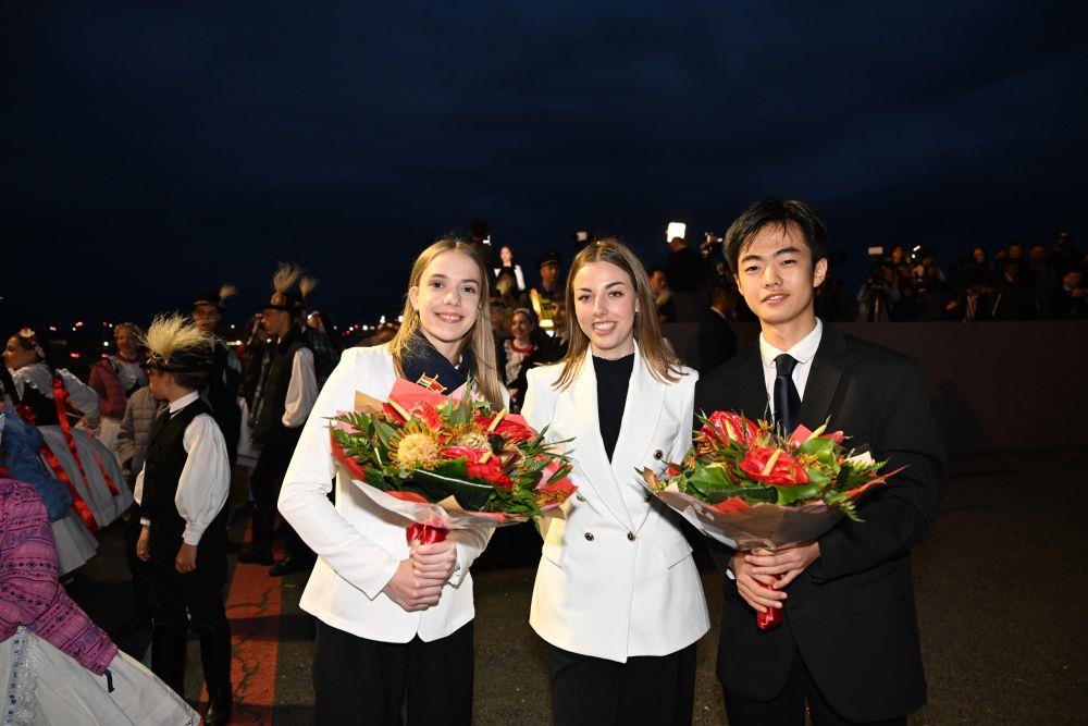 當地時間5月8日晚,在匈牙利布達佩斯國際機場,匈牙利姑娘歐拉·塔瑪拉(中)與匈中雙語學校兩名參加歡迎儀式的學生合影。