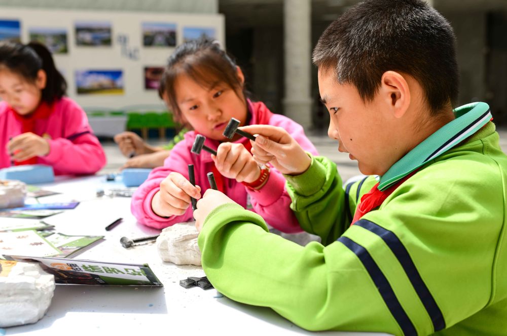 2024年4月22日,內蒙古自治區鄂爾多斯市康巴什區實驗小學在康巴什自然博物館開展“探索自然奧秘 保護地球家園”主題研學活動,這是學生在研學課程中體驗尋找動物化石。