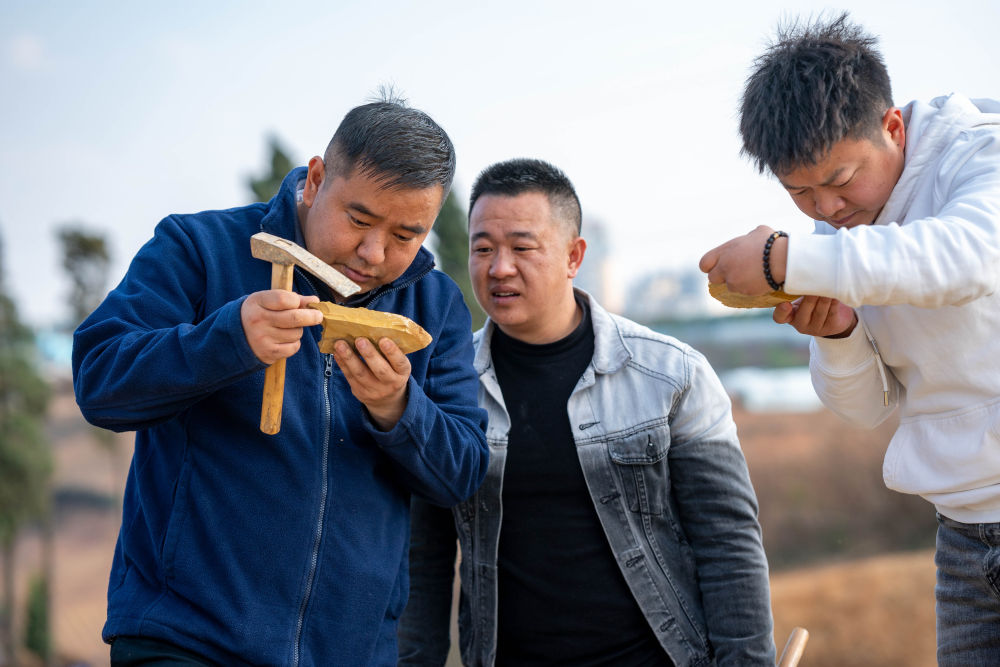 2024年2月22日,云南澄江化石地世界自然遺產博物館副館長郭進(左一)和同事在云南省澄江市黑蟆地查看采集到的化石標本。