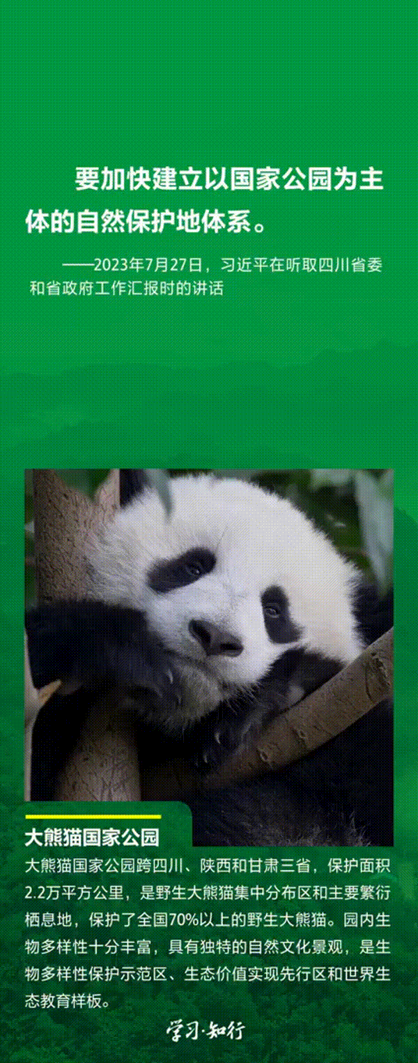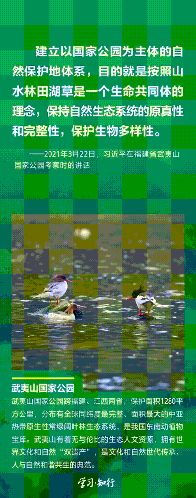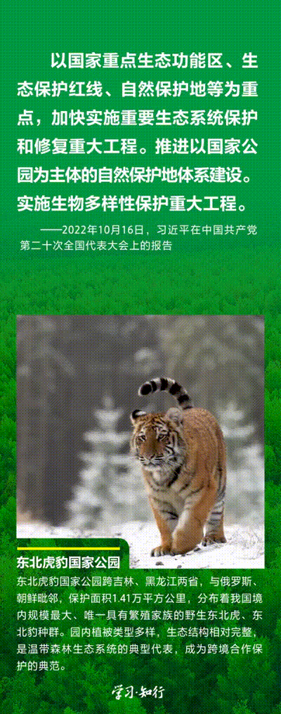“生物多樣性使地球充滿生機,也是人類生存和發展的基礎。”推進以國家公園為主體的自然保護地體系建設,是習近平總書記作出的重要部署。三江源、大熊貓、東北虎豹、海南熱帶雨林、武夷山等首批國家公園正式設立以來,生態功能持續向好,對保護生物多樣性、推進人與自然和諧共生的現代化具有重要意義。